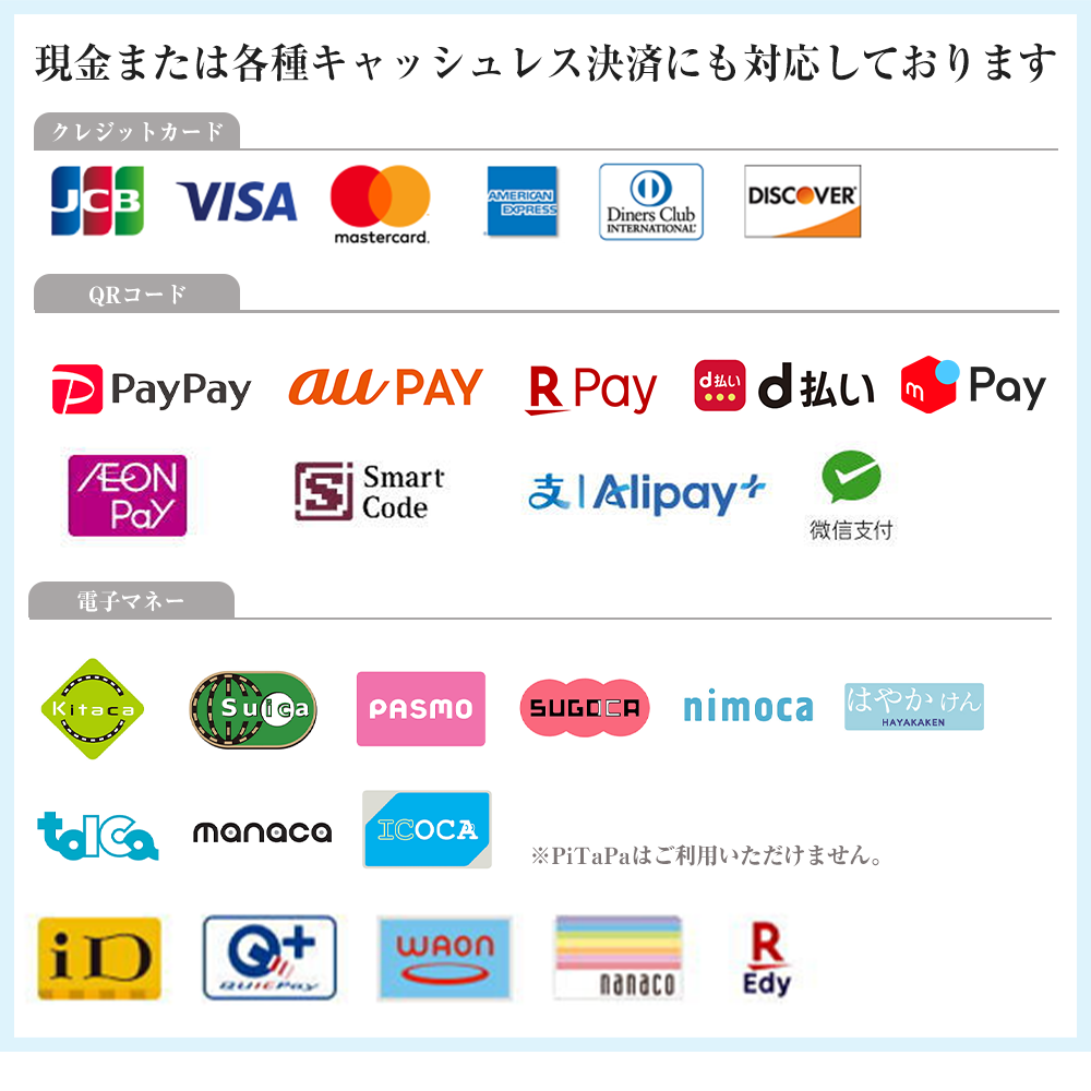 はい、お支払方法は現金の他、クレジットカード、QRコード、交通IC、電子マネーもご利用いただけます。